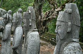 Thom, the last great capital of the Khmer Empire. Highlights include the magnificent Bayon, one of the most recognisable sites because of the 54 towers adorned with 216 enigmatically smiling stone faces, the Terrace of Elephants, a giant viewing stand for public ceremonies and the Terrace of Leper Kings, whose walls boast beautifully carved nagas, demons and other mythological beings. In the low morning sun the carvings really stand out and as you stand on the Terrace of Elephants you get a great view across a parkland scene interspersed with giant trees protected in the National Park.
